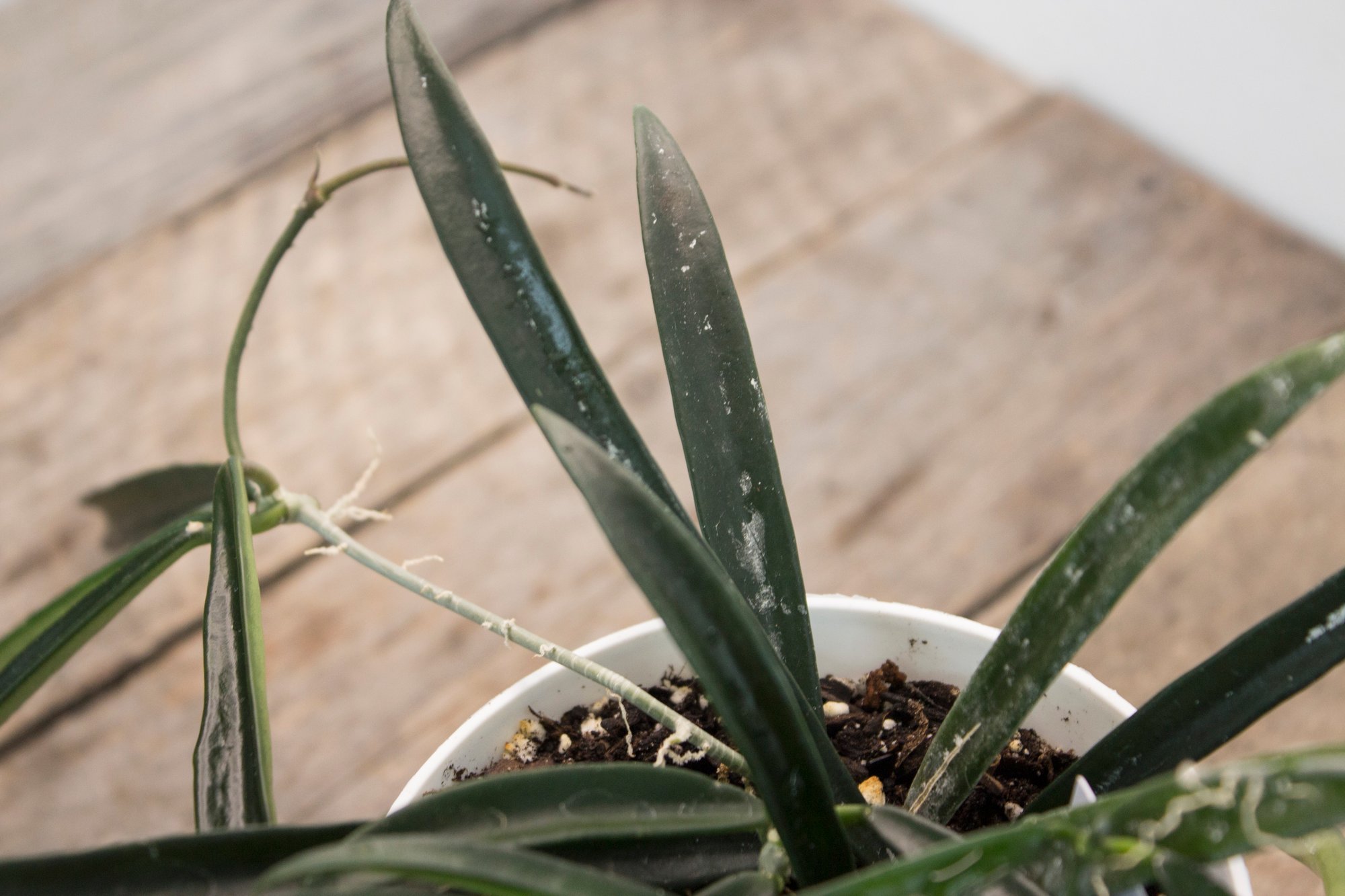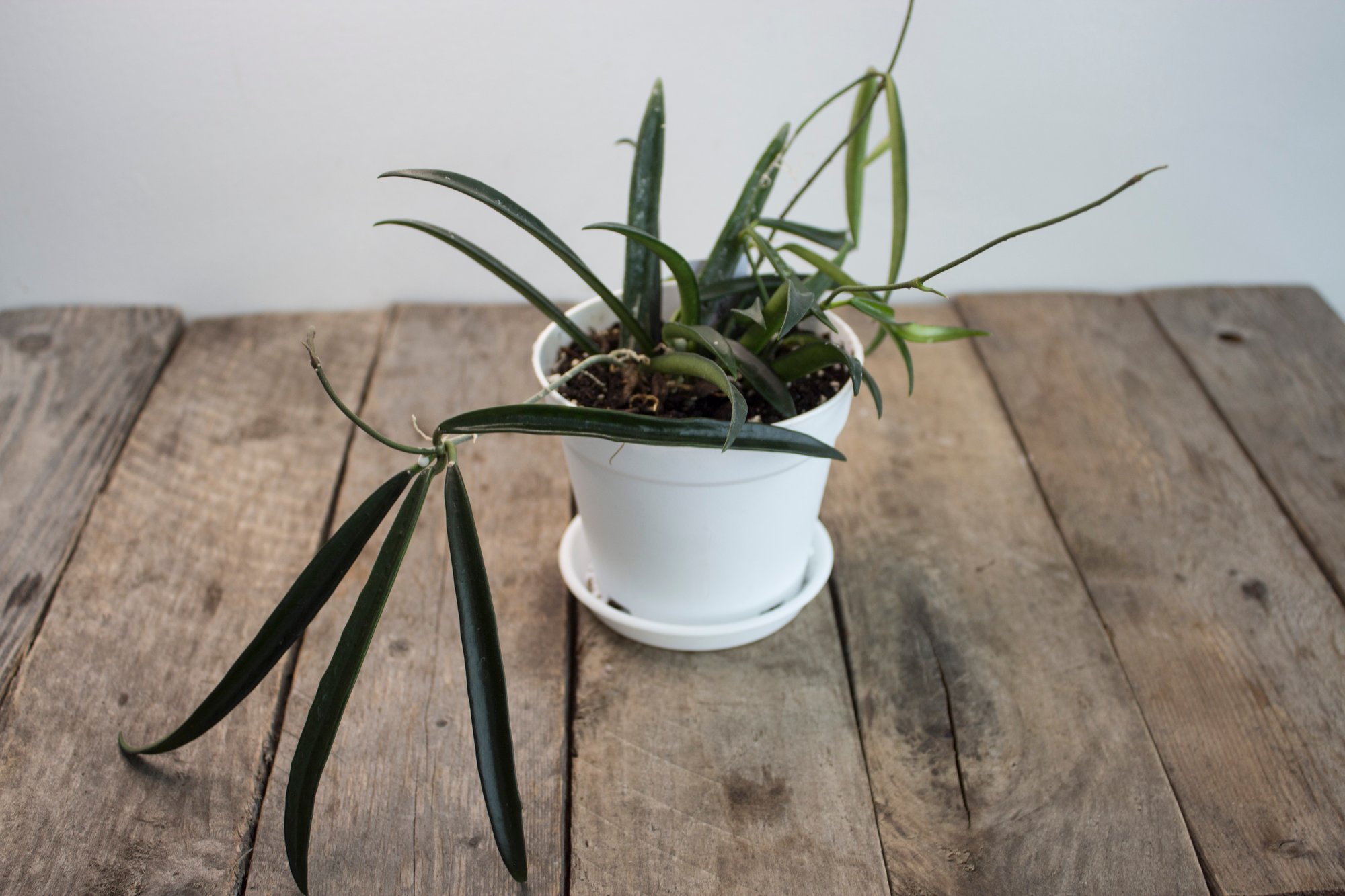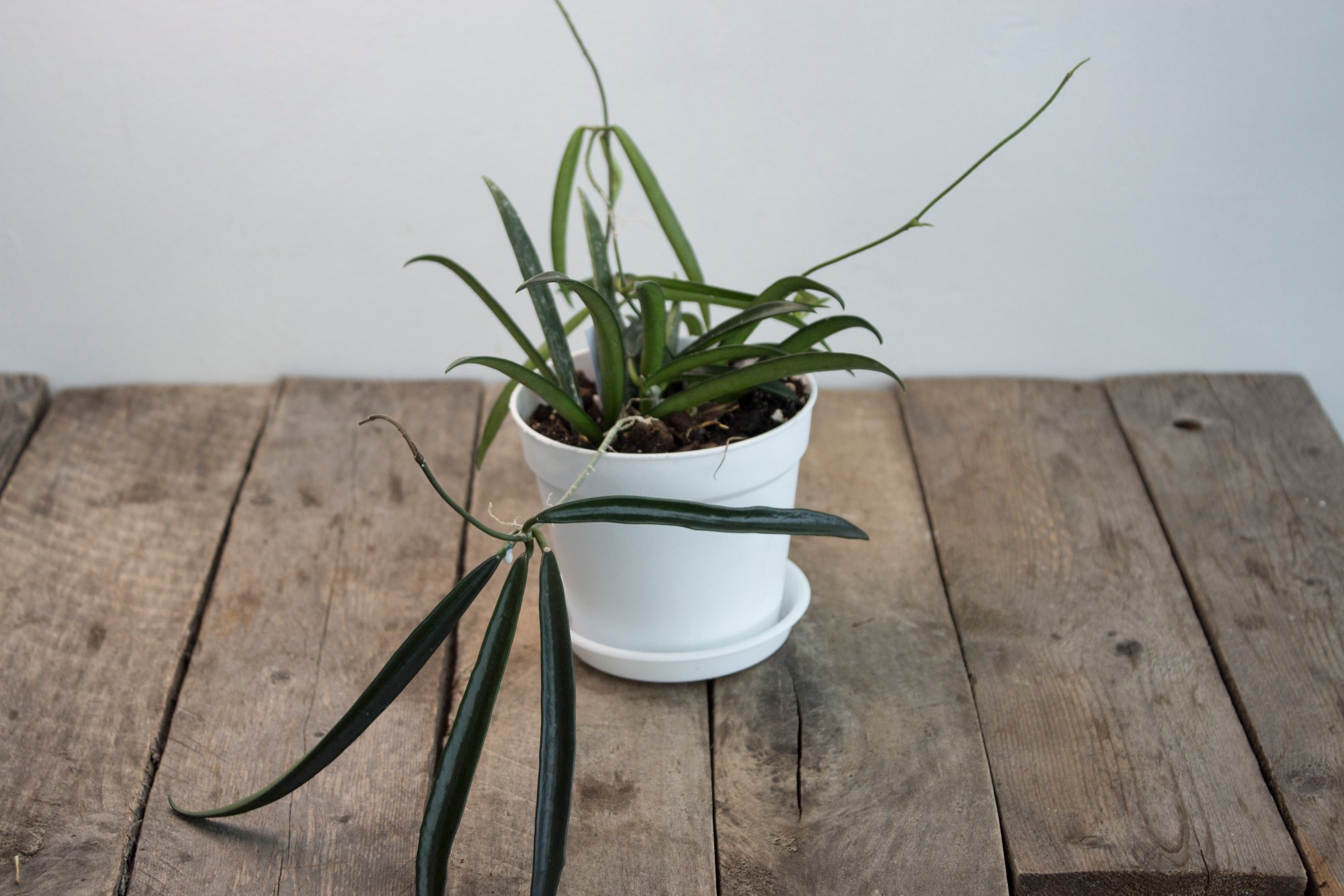 The Hoya shepherdii, often nicknamed the “String Bean Hoya,” is a striking and easy-care plant that brings a touch of the exotic to any indoor space. Its long, slender, deep-green leaves resemble beans or narrow pods, creating an elegant, sculptural effect that’s perfect for hanging baskets or high shelves. When mature and happy, it produces clusters of star-shaped, creamy-white flowers with a rich fragrance—an irresistible treat for any Hoya enthusiast.